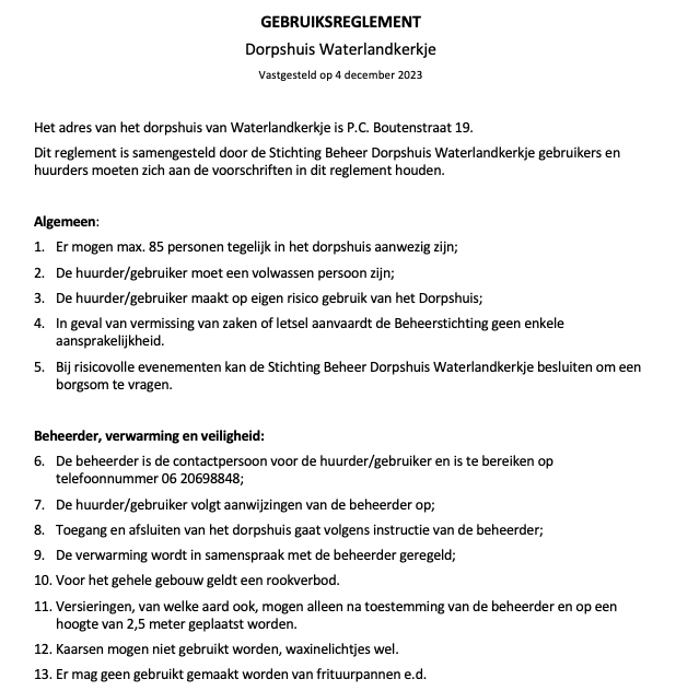 Iedereen die gebruik maakt van het dorpshuis, houdt zich aan de regels die hieronder staan.